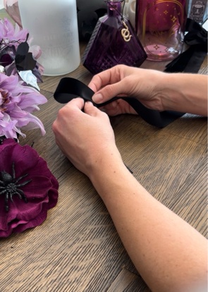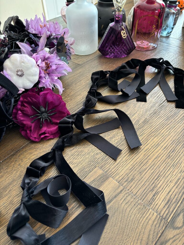 I was out shopping for Halloween decor and DIY supplies while the kiddos were at school and was able to hit up a couple of crafting stores here in town. I was on the hunt for black or soft purple velvet ribbon. Micheal’s ended up having various sizes of purple ribbon so I picked up a few and decided to try Hobby Lobby. Lo and behold, while walking through the Christmas ribbon I spotted the PERFECT black velvet ribbon in 2 different sizes at HL. Soft, velvet and rich looking – so gorgeous and perfect for this project. This is the ribbon I used to make the garland.